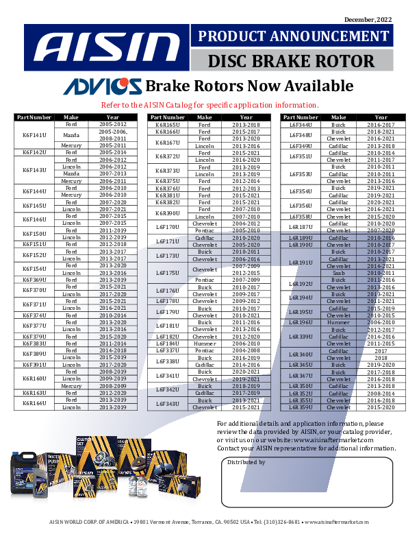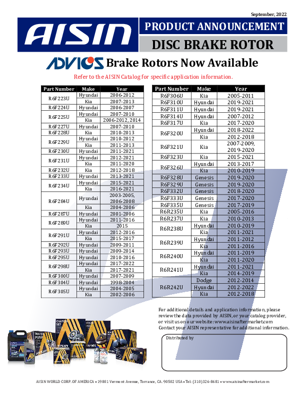 Any and all new product buttetins and information will be posted here for both AISIN and ADVICS. Please check back frequently as these are constantly being updated.
