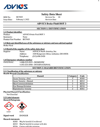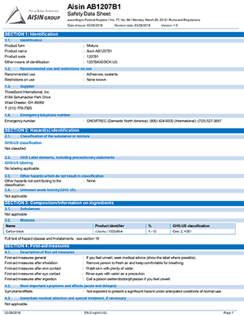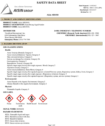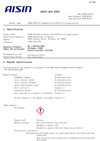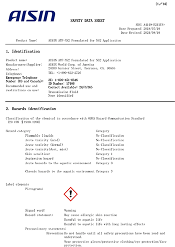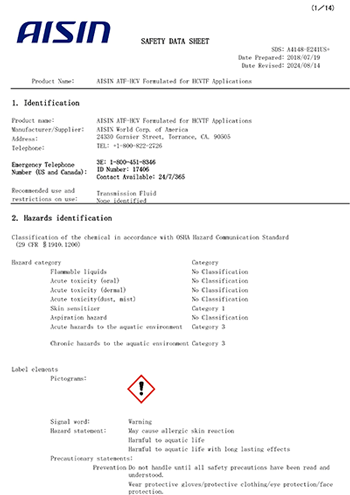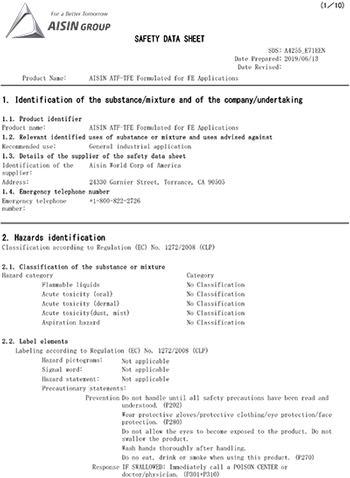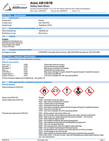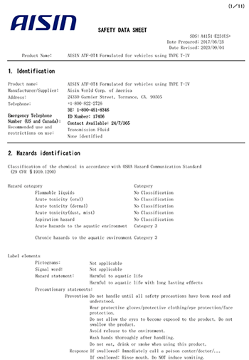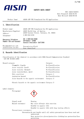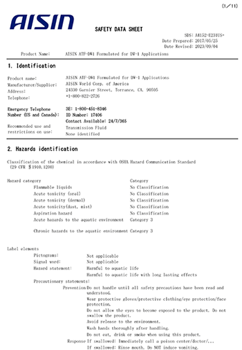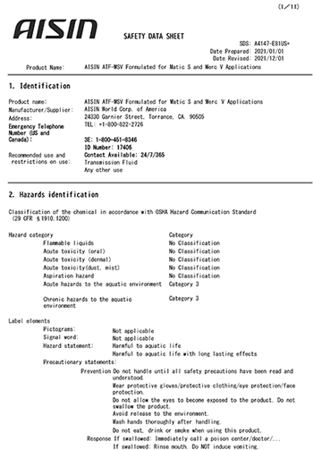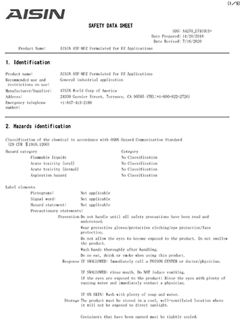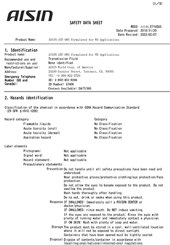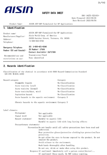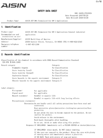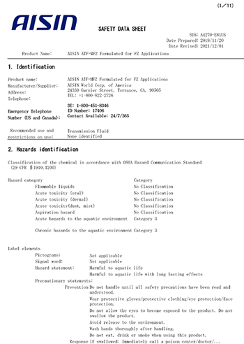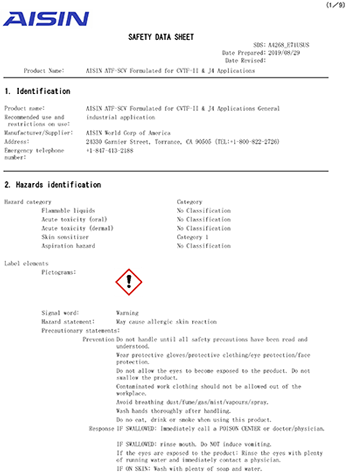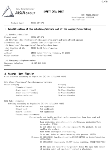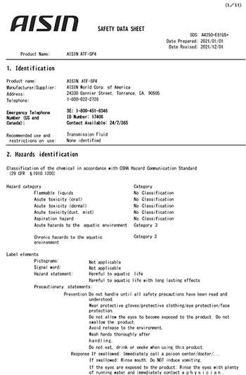 Welcome to the AISIN Safety Data Sheet Library. This section provides the latest Safety Data Sheets (SDS) for AISIN chemical and fluid products. Each document contains important information on proper handling, storage, and safety precautions to help maintain a safe and compliant work environment.